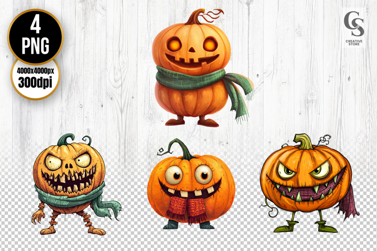4 Spooky Pumpkin Character Clipart PNG Files Perfect for Greeting Cards, Invitations, Junk Journal, Party Decor, Scrapbooking and many other craft projects.