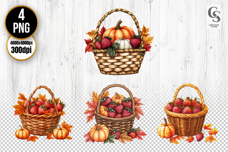 4 Strawberry and Pumpkin Basket Clipart PNG Files Perfect for Greeting Cards, Invitations, Junk Journal, Party Decor, Scrapbooking and many other craft projects.