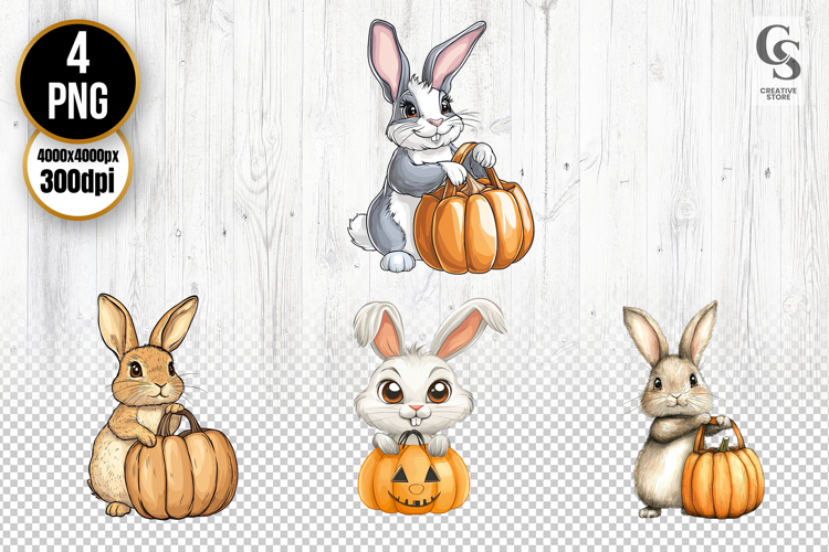 4 Cute Bunny with Pumpkin Basket Clipart PNG Files Perfect for Greeting Cards, Invitations, Junk Journal, Party Decor, Scrapbooking and many other craft projects.