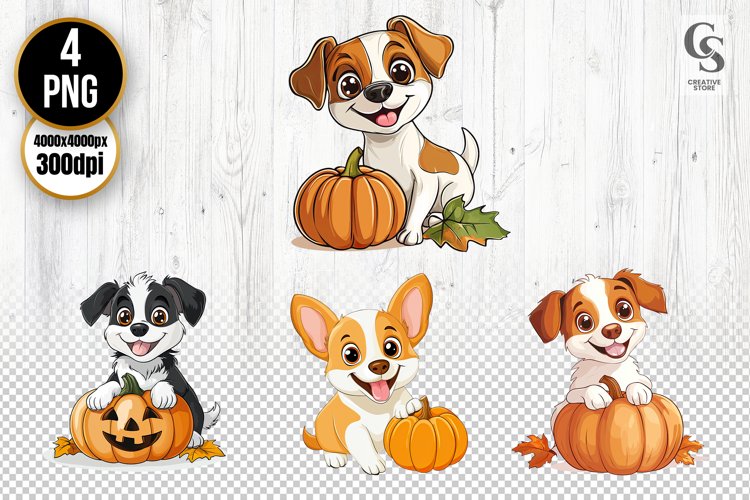4 Cute Puppy with Pumpkin Clipart PNG Files Perfect for Greeting Cards, Invitations, Junk Journal, Party Decor, Scrapbooking and many other craft projects.