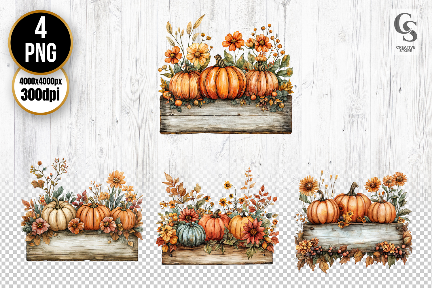4 Pumpkin Wooden Box Floral Arrangement Clipart PNG Files Perfect for Greeting Cards, Invitations, Junk Journal, Party Decor, Scrapbooking and many other craft projects.