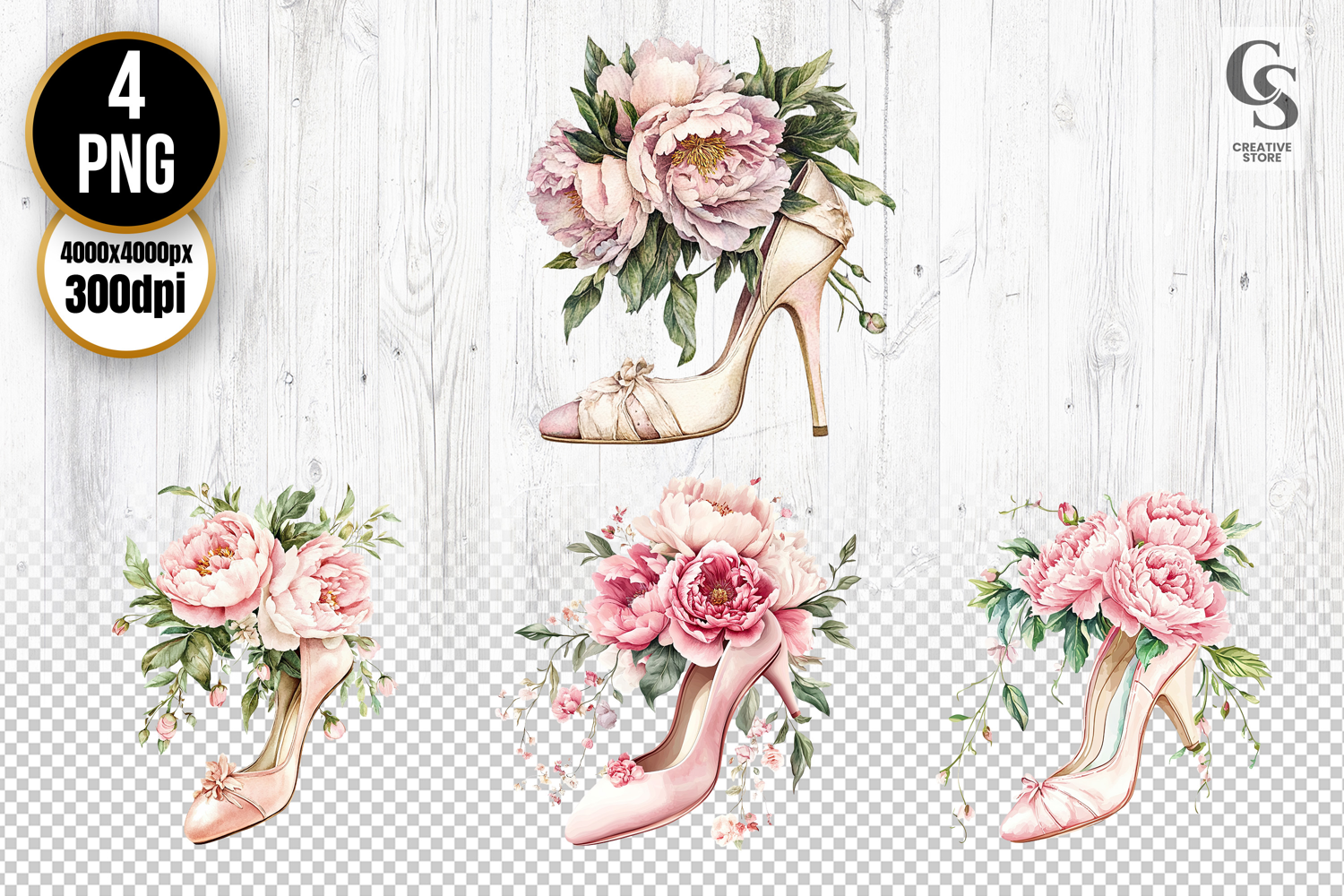 4 Elegant Floral High Heel Shoe Watercolor Clipart Sublimation PNG Files Perfect for Greeting Cards, Invitations, Junk Journal, Party Decor, Scrapbooking and many other craft projects.