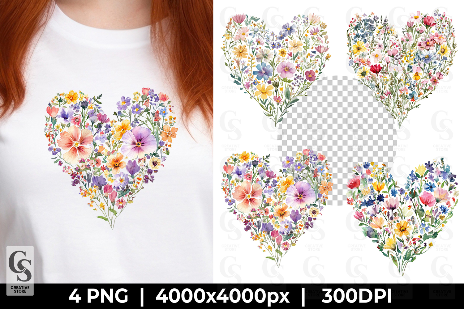 4 Watercolor Wildflower Heart Floral Bouquet Clipart Sublimation PNG Files Perfect for Greeting Cards, Invitations, Junk Journal, Party Decor, Scrapbooking and many other craft projects.