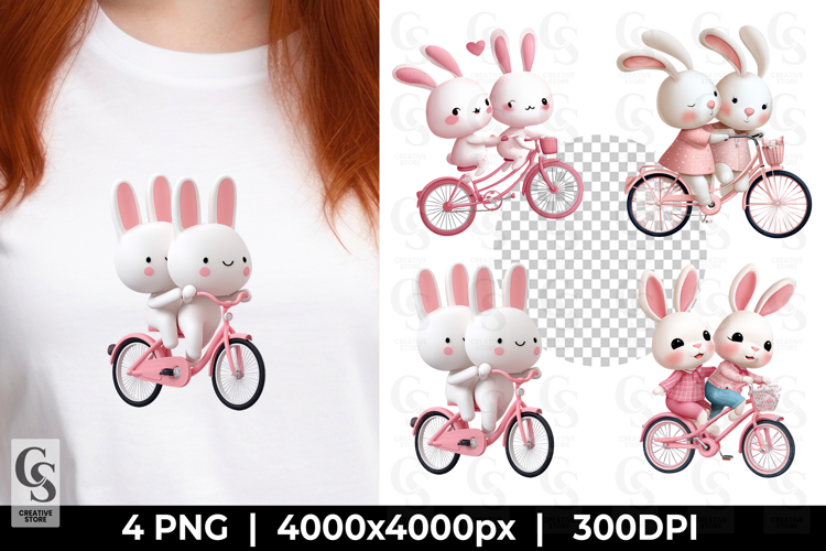 4 Cute Bunny Couple Bicycle Clipart | Romantic Rabbit Love Sublimation PNG Files Perfect for Greeting Cards, Invitations, Junk Journal, Party Decor, Scrapbooking and many other craft projects.