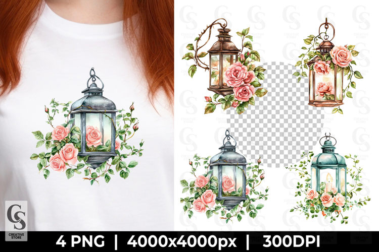4 Vintage Lantern with Roses Clipart Sublimation PNG Files Perfect for Greeting Cards, Invitations, Junk Journal, Party Decor, Scrapbooking and many other craft projects.