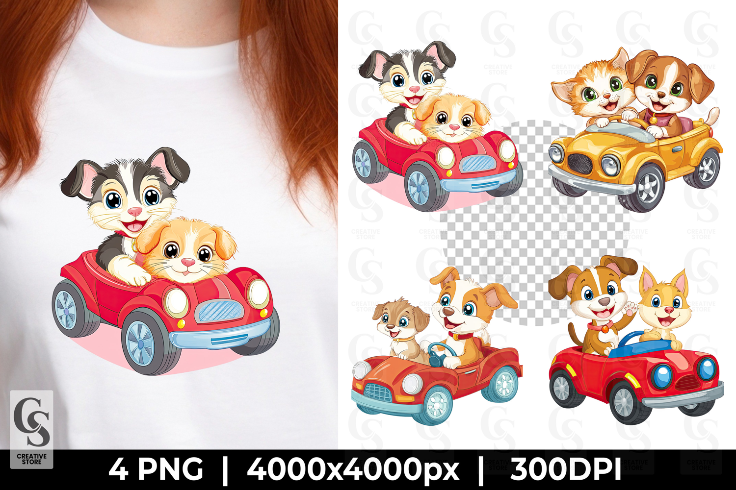4 Cute Puppies Driving Car Clipart Sublimation PNG Files Perfect for Greeting Cards, Invitations, Junk Journal, Party Decor, Scrapbooking and many other craft projects.