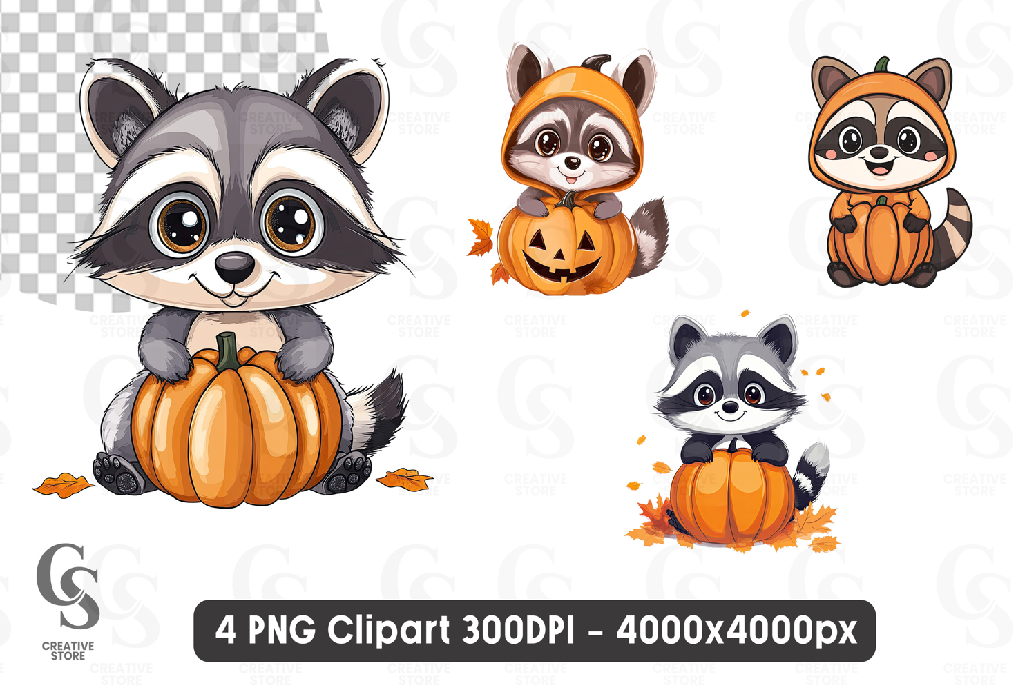 4 Cute Kawaii Raccoon with Pumpkin Clipart Sublimation PNG Files Perfect for Greeting Cards, Invitations, Junk Journal, Party Decor, Scrapbooking and many other craft projects.