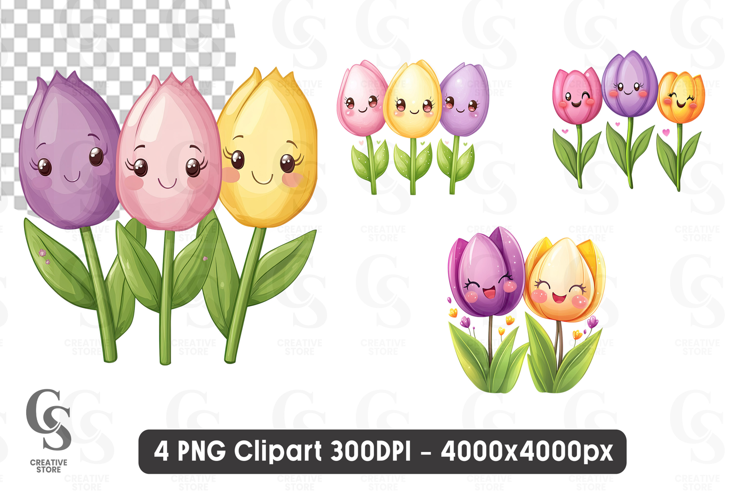 4 Cute Kawaii Tulip Flowers Clipart PNG Sublimation Files Perfect for Greeting Cards, Invitations, Junk Journal, Party Decor, Scrapbooking and many other craft projects.