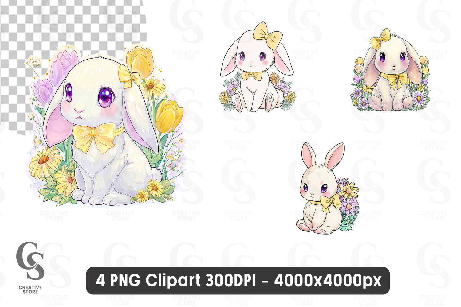 4 Cute Bunny with Flowers Yellow Bow Easter Spring Clipart Sublimation PNG Files Perfect for Greeting Cards, Invitations, Junk Journal, Party Decor, Scrapbooking and many other craft projects.
