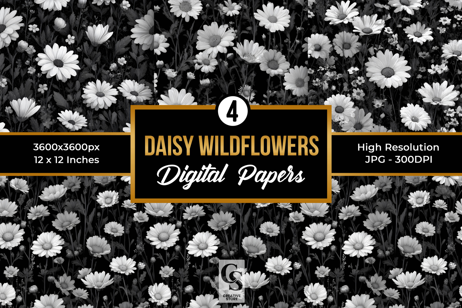 Black And White Digital Paper Monochrome Seamless Pattern Commercial Use Wildflower Floral Design Daisy Pattern Fabric Print Minimalist Floral