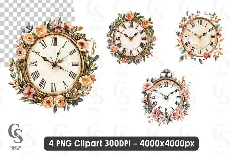 4 Vintage Floral Clock Clipart Sublimation PNG Perfect for Greeting Cards, Invitations, Junk Journal, Party Decor, Scrapbooking and many other craft projects.