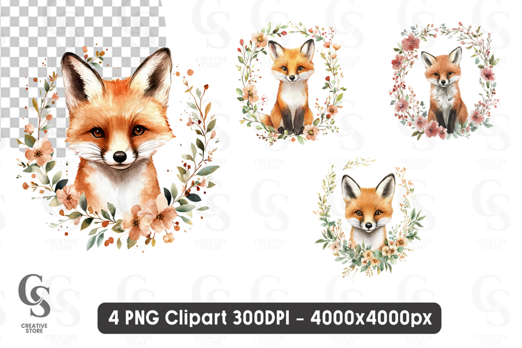 4 Cute Fox with Floral Wreath Watercolor Clipart Sublimation PNG Files Perfect for Greeting Cards, Invitations, Junk Journal, Party Decor, Scrapbooking and many other craft projects.