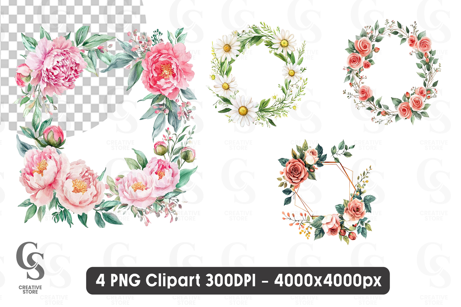 4 Watercolor Floral Wreath with Roses and Peonies Clipart Sublimation PNG Files Perfect for Greeting Cards, Invitations, Junk Journal, Party Decor, Scrapbooking and many other craft projects.