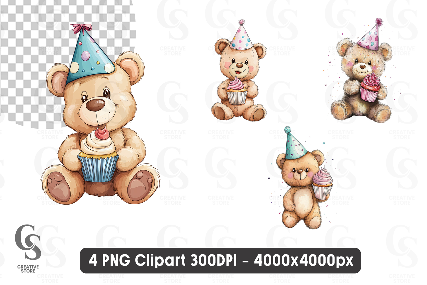 4 Birthday Teddy Bear Cupcake Clipart PNG Perfect for Greeting Cards, Invitations, Junk Journal, Party Decor, Scrapbooking and many other craft projects.