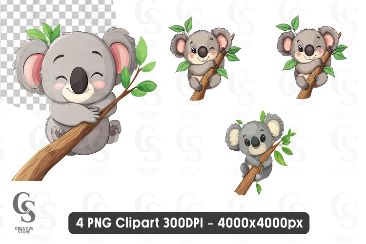 4 Cute Koala Clipart Set PNG Perfect for Greeting Cards, Invitations, Junk Journal, Party Decor, Scrapbooking and many other craft projects.