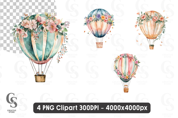 4 Watercolor Floral Hot Air Balloon Set clipart sublimation png Files Perfect for Greeting Cards, Invitations, Junk Journal, Party Decor, Scrapbooking and many other craft projects.