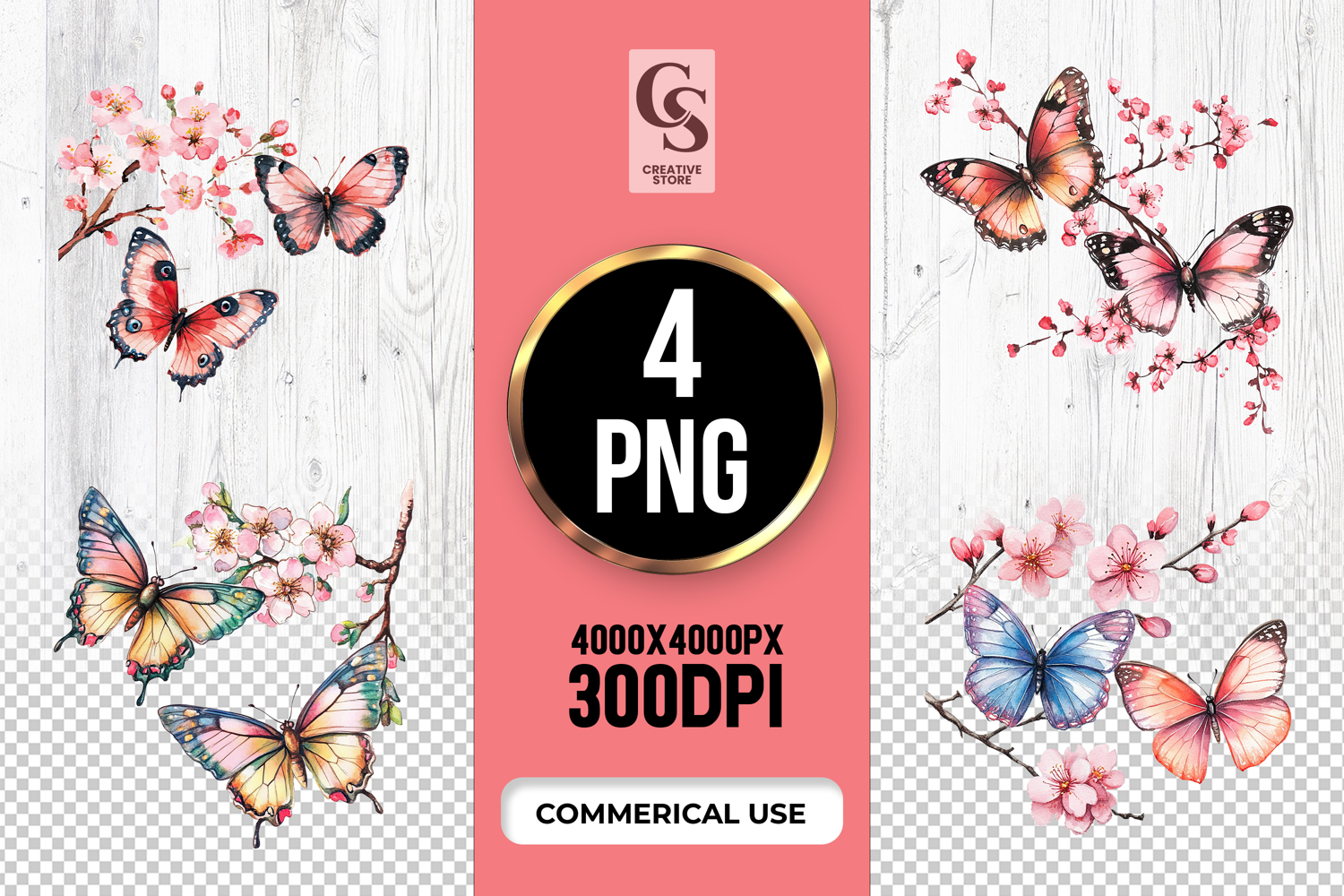 4 Floral Watercolor Butterfly Clipart Sublimation PNG Files Perfect for Greeting Cards, Invitations, Junk Journal, Party Decor, Scrapbooking and many other craft projects.