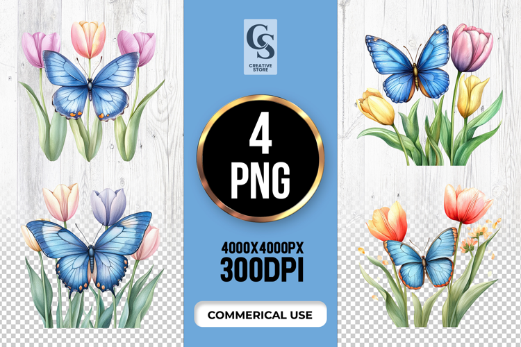 4 Tulip Butterfly Watercolor Clipart Sublimation PNG Files Perfect for Greeting Cards, Invitations, Junk Journal, Party Decor, Scrapbooking and many other craft projects.