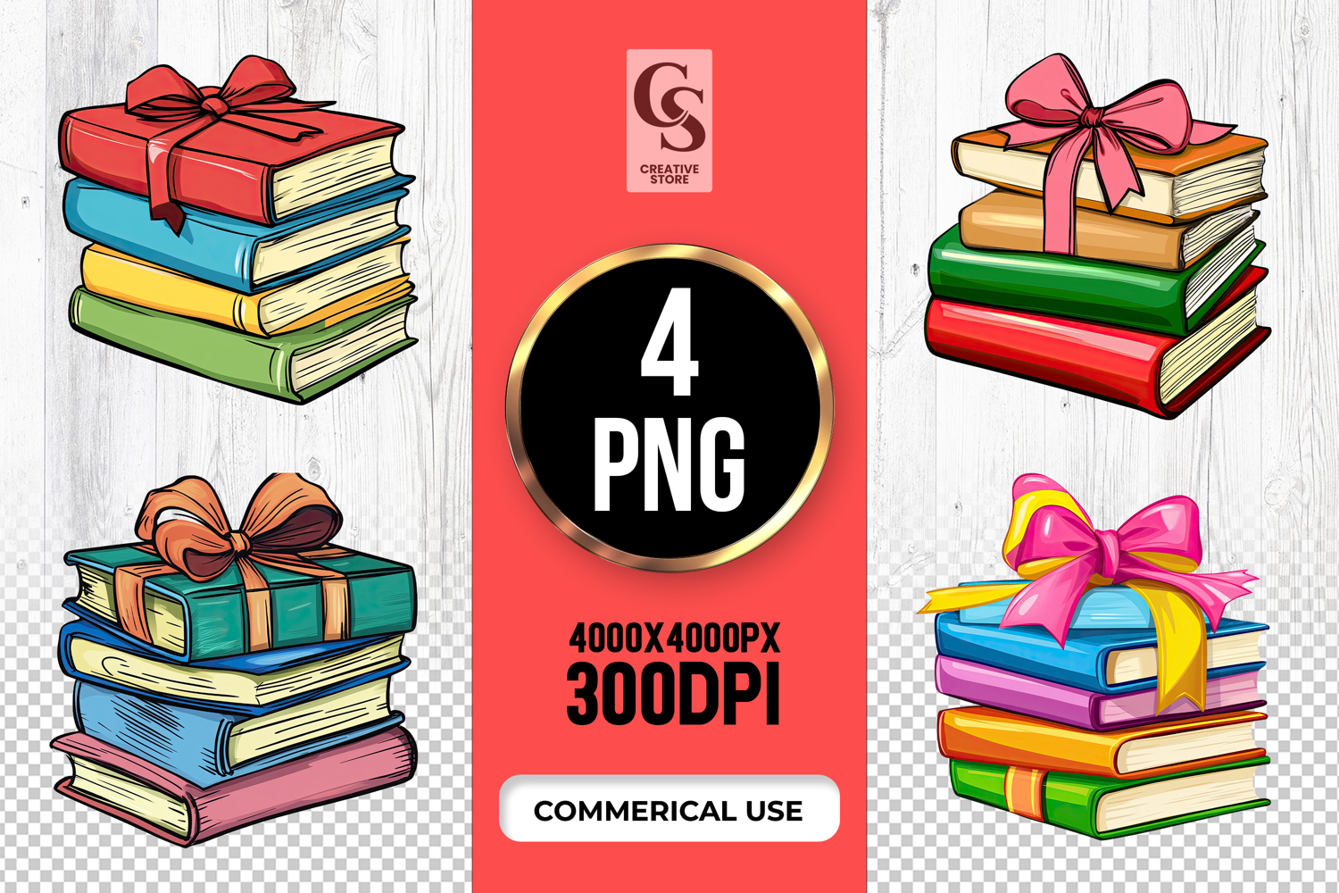 4 Stacked Books With Ribbon Bow clipart sublimation png Files Perfect for Greeting Cards, Invitations, Junk Journal, Party Decor, Scrapbooking and many other craft projects.