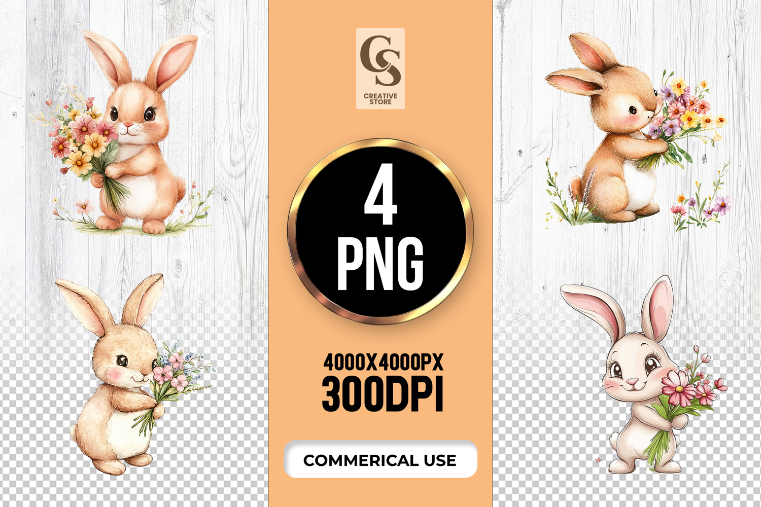4 Cute Bunny Holding Flowers clipart sublimation png Files Perfect for Greeting Cards, Invitations, Junk Journal, Party Decor, Scrapbooking and many other craft projects.