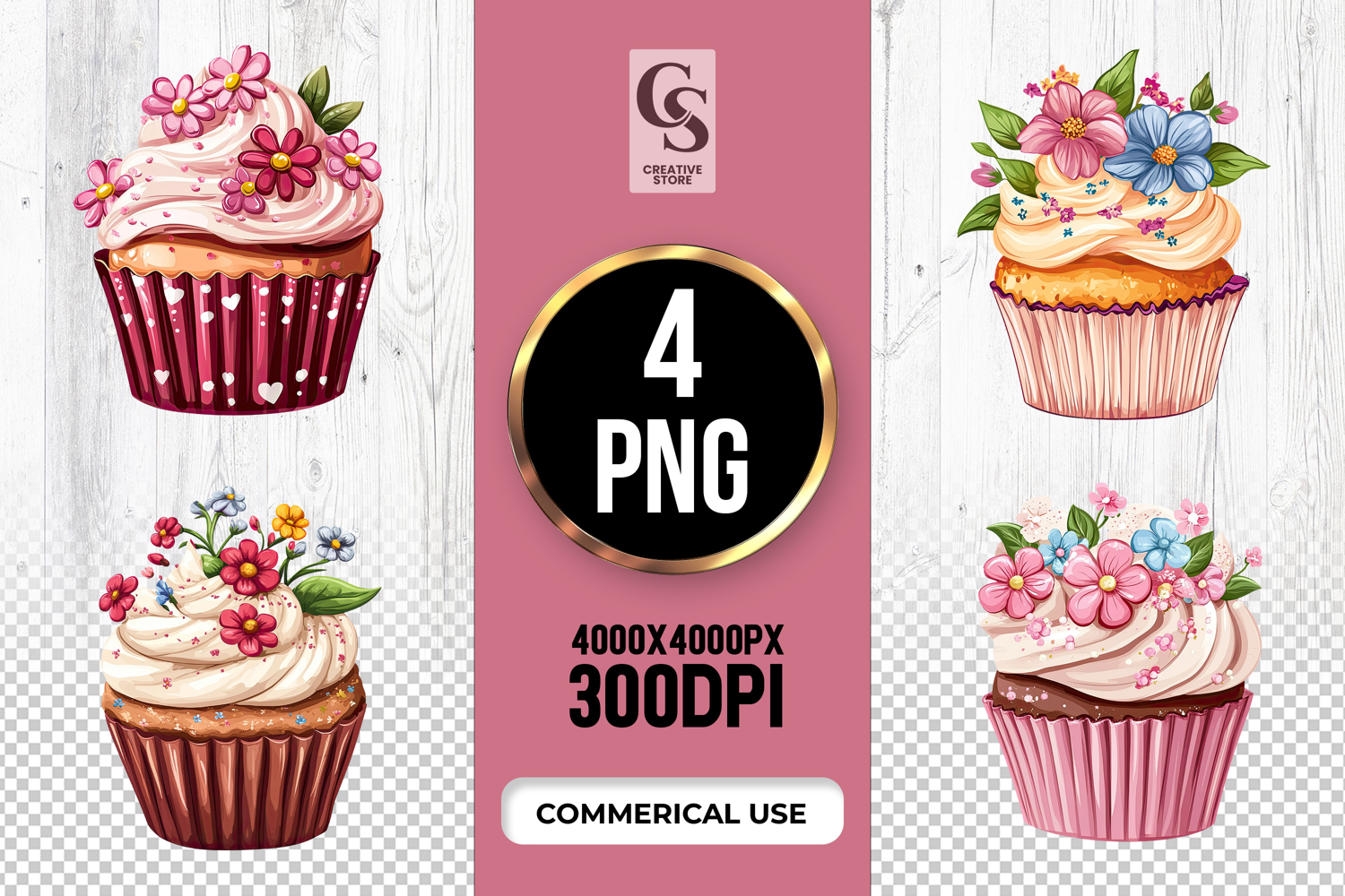 4 Floral Cupcake Dessert Clipart sublimation png Files Perfect for Greeting Cards, Invitations, Junk Journal, Party Decor, Scrapbooking and many other craft projects.