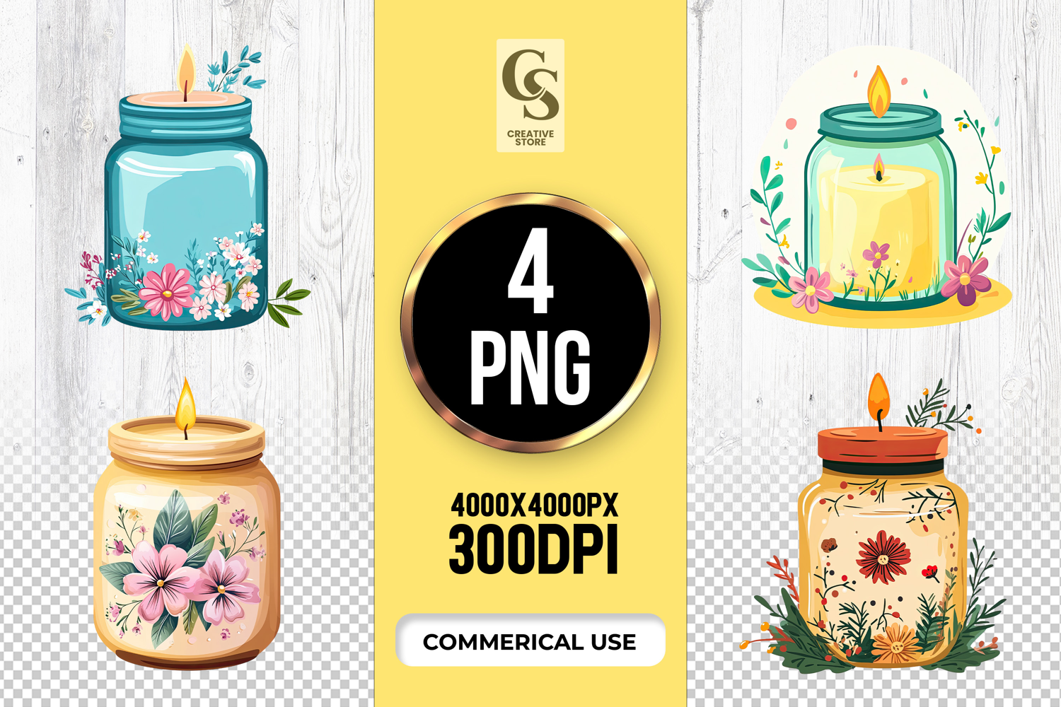 4 Floral Candle Jar Clipart Sublimation PNG Files Perfect for Greeting Cards, Invitations, Junk Journal, Party Decor, Scrapbooking and many other craft projects.