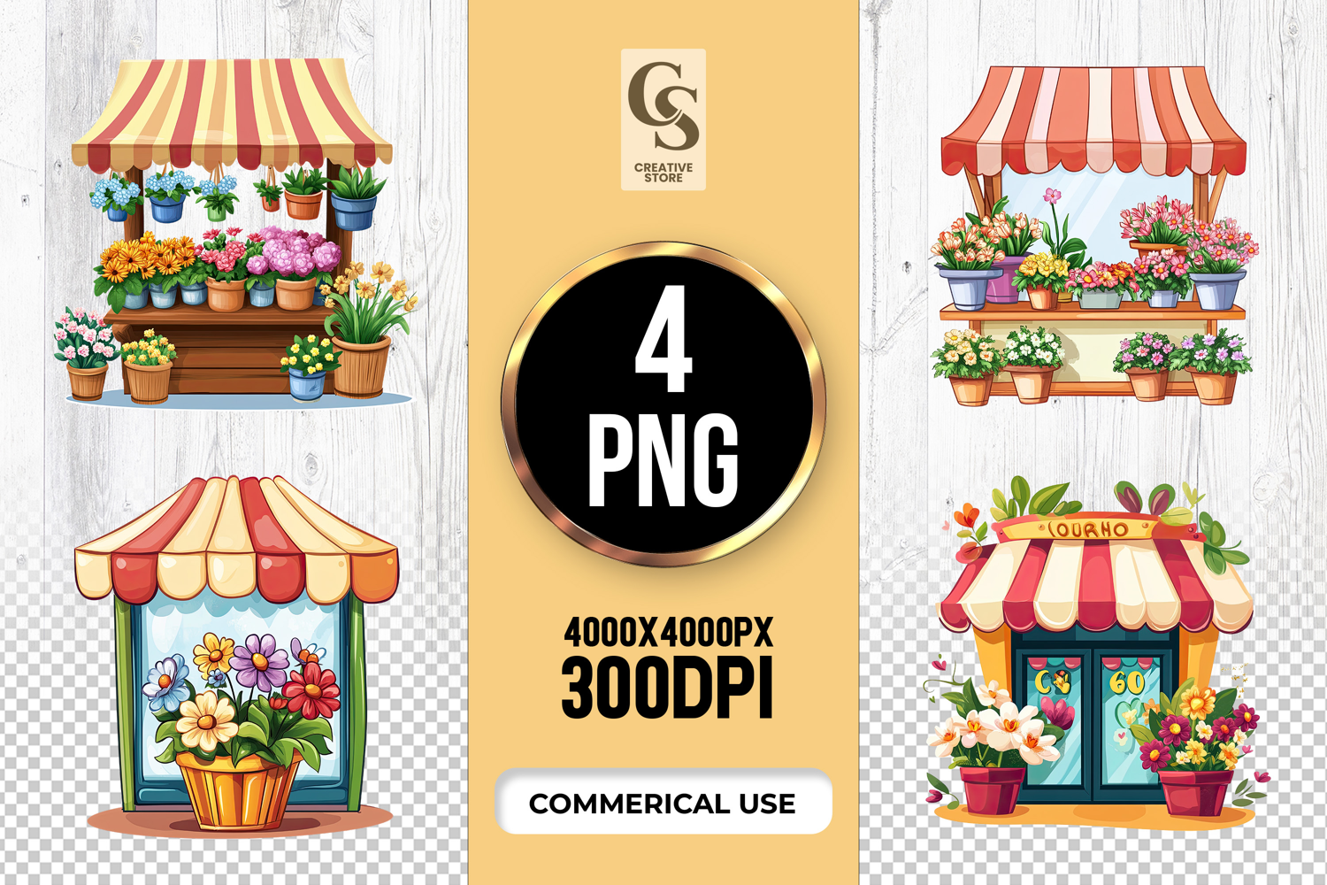 4 Flower Shop Front Clipart Sublimation PNG Files Perfect for Greeting Cards, Invitations, Junk Journal, Party Decor, Scrapbooking and many other craft projects.