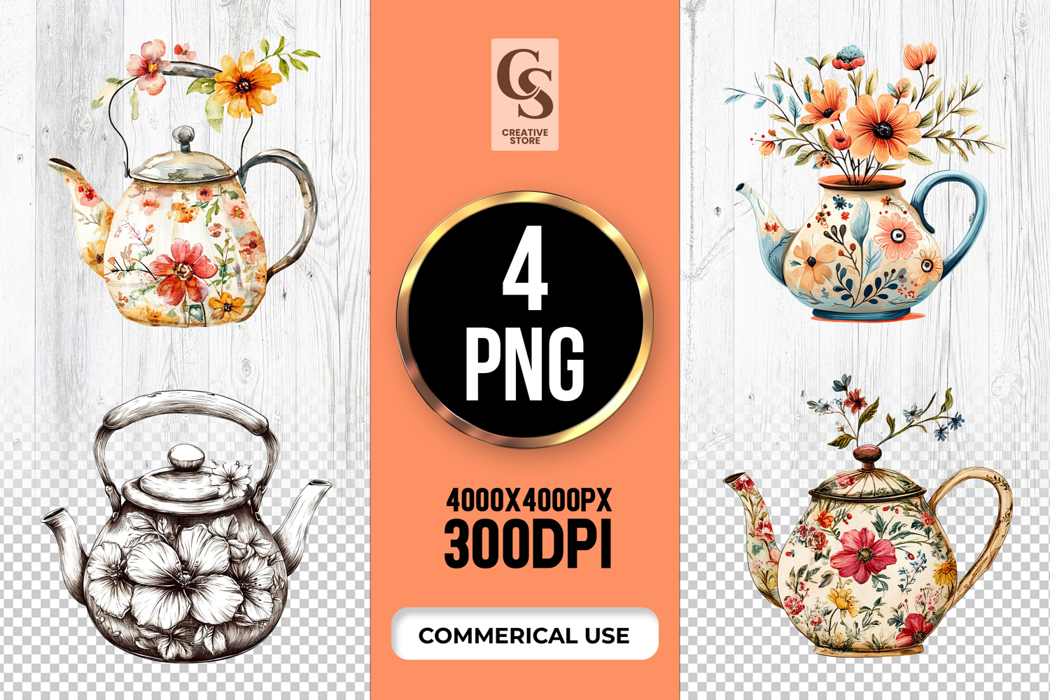 4 Floral Teapot Watercolor Clipart Sublimation PNG Files Perfect for Greeting Cards, Invitations, Junk Journal, Party Decor, Scrapbooking and many other craft projects.