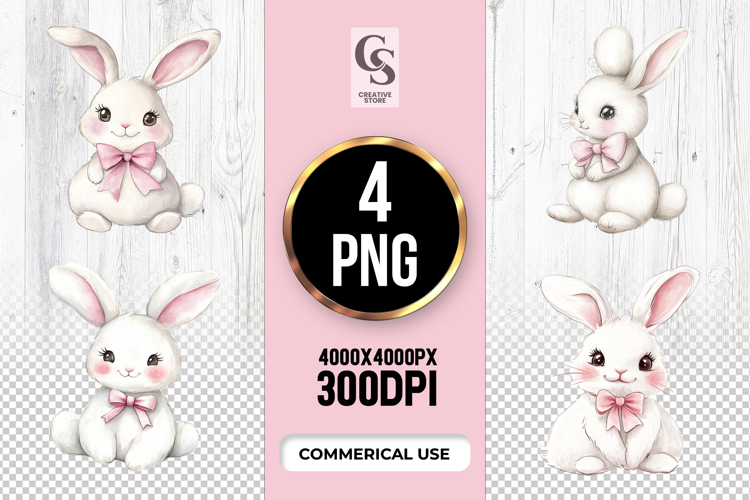 4 Cute White Bunny Clipart Sublimation PNG Files Perfect for Greeting Cards, Invitations, Junk Journal, Party Decor, Scrapbooking and many other craft projects.