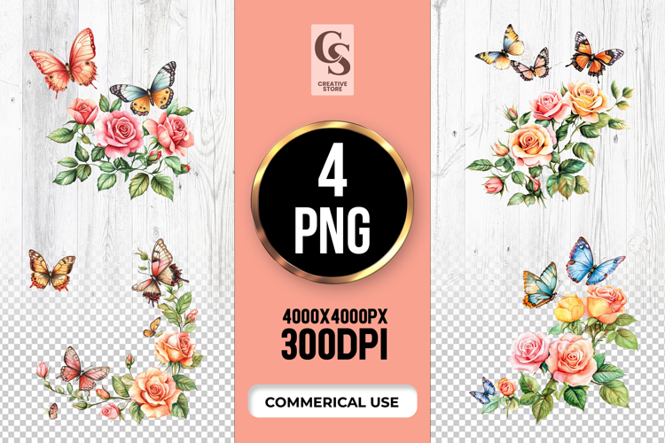 4 Rose and Butterfly Clipart Sublimation PNG Files Perfect for Greeting Cards, Invitations, Junk Journal, Party Decor, Scrapbooking and many other craft projects.