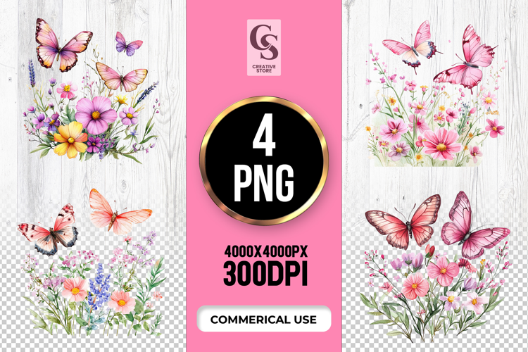 4 Butterfly Wildflower Clipart Sublimation PNG Files Perfect for Greeting Cards, Invitations, Junk Journal, Party Decor, Scrapbooking and many other craft projects.