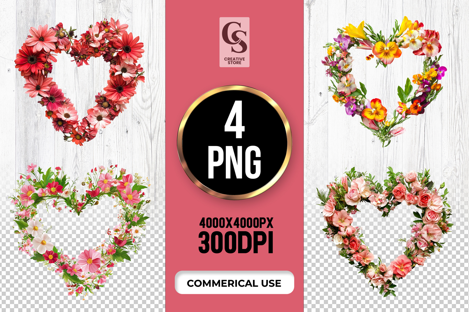 4 Floral Heart Wreath Clipart PNG Set Files Perfect for Greeting Cards, Invitations, Junk Journal, Party Decor, Scrapbooking and many other craft projects.