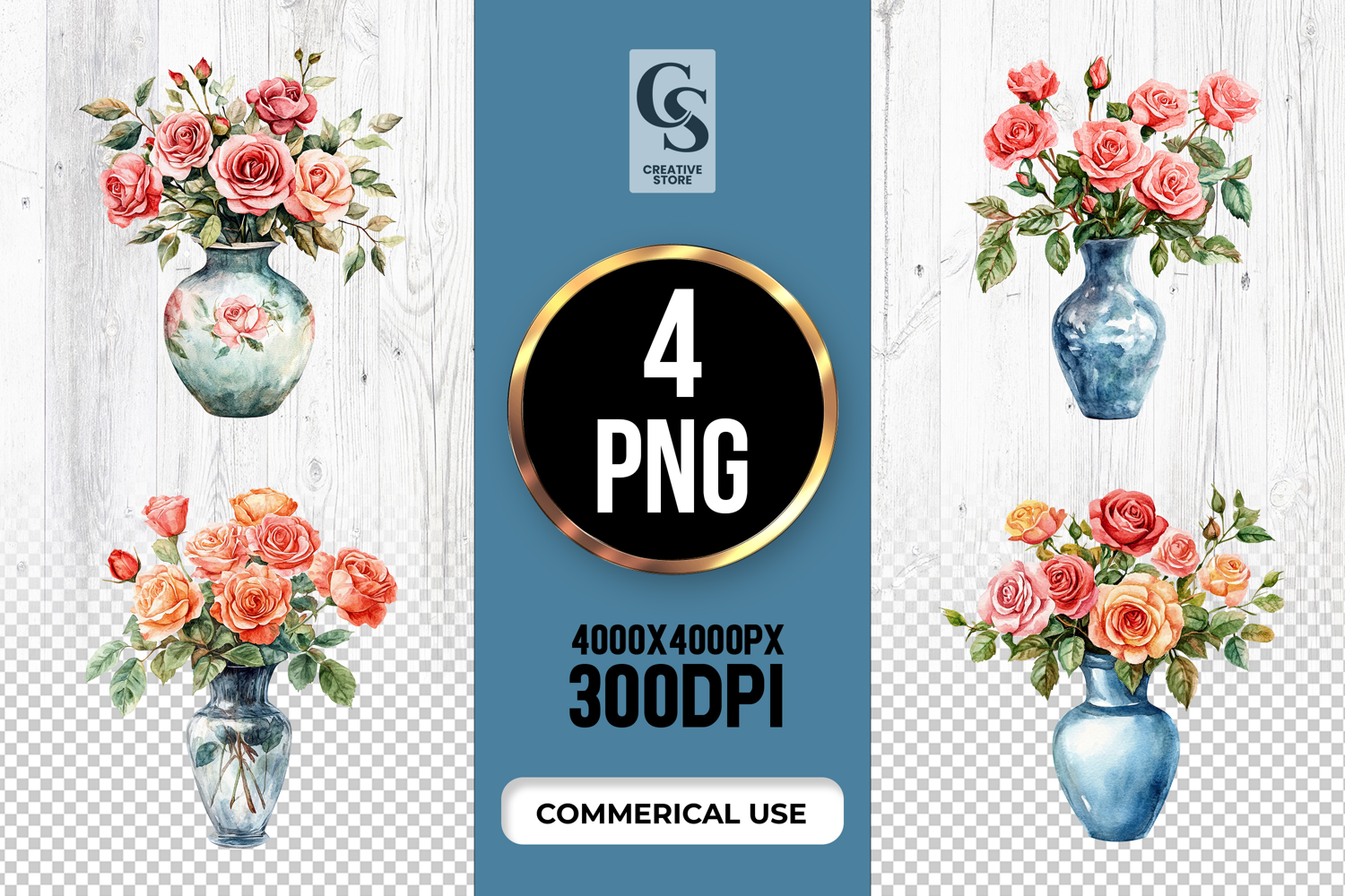 4 Watercolor Rose Vase PNG Set Files Perfect for Greeting Cards, Invitations, Junk Journal, Party Decor, Scrapbooking and many other craft projects.