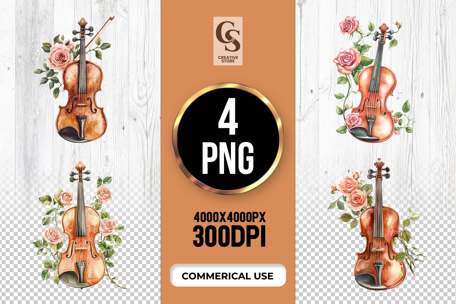 4 Floral Violin Watercolor Clipart Sublimation PNG Files Perfect for Greeting Cards, Invitations, Junk Journal, Party Decor, Scrapbooking and many other craft projects.