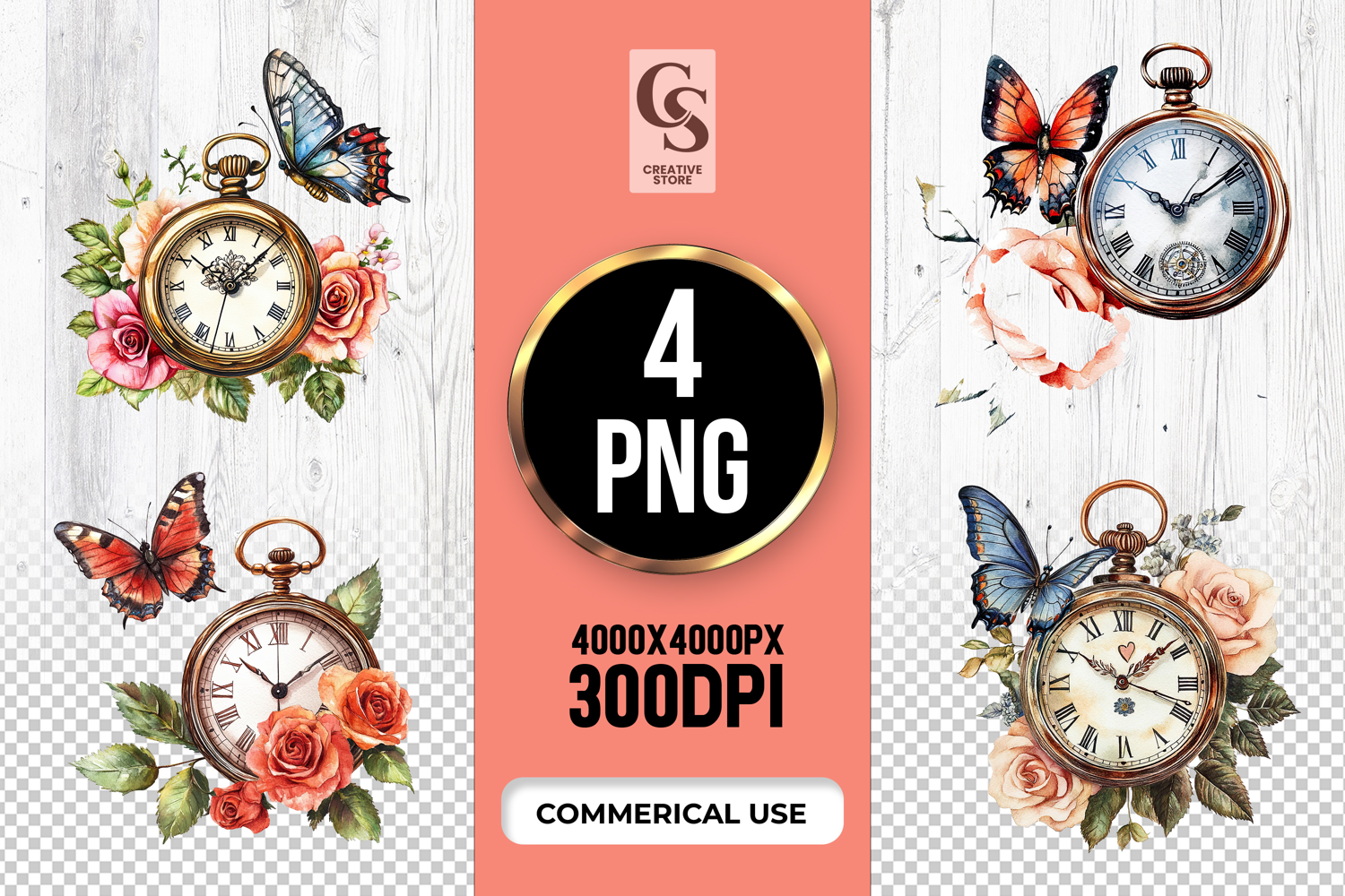 4 Vintage Pocket Watch Clipart Sublimation PNG Files Perfect for Greeting Cards, Invitations, Junk Journal, Party Decor, Scrapbooking and many other craft projects.