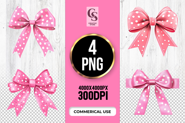 4 Pink Polka Dot Ribbon Bow Clipart Sublimation PNG Files Perfect for Greeting Cards, Invitations, Junk Journal, Party Decor, Scrapbooking and many other craft projects.