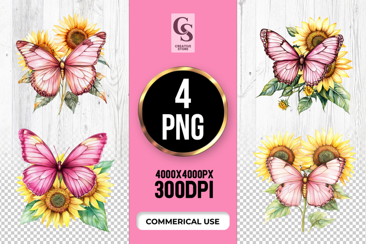 4 Pink Butterfly with Sunflower Clipart Sublimation PNG Files Perfect for Greeting Cards, Invitations, Junk Journal, Party Decor, Scrapbooking and many other craft projects.