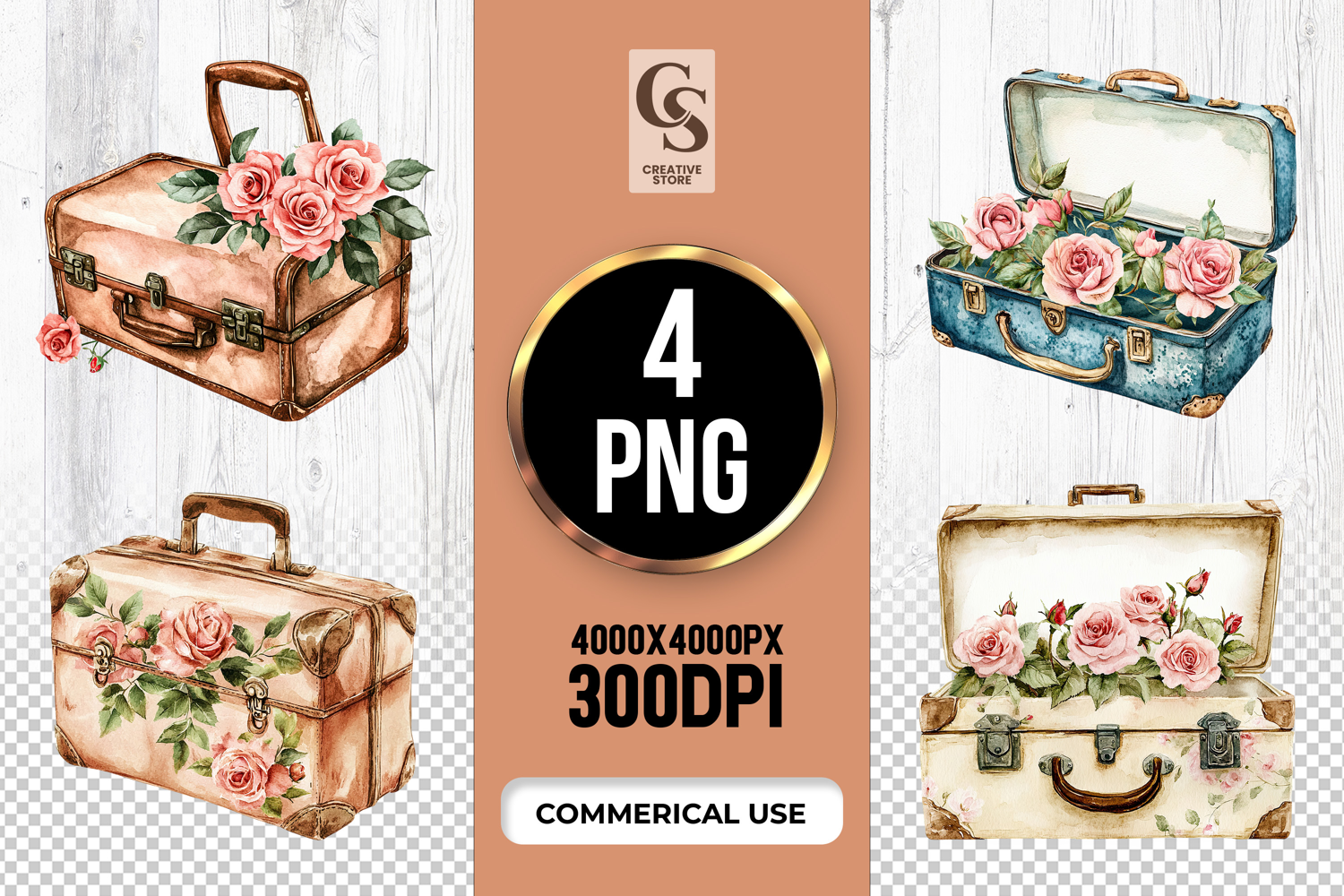 4 Vintage Suitcase with Roses Clipart Sublimation PNG Files Perfect for Greeting Cards, Invitations, Junk Journal, Party Decor, Scrapbooking and many other craft projects.
