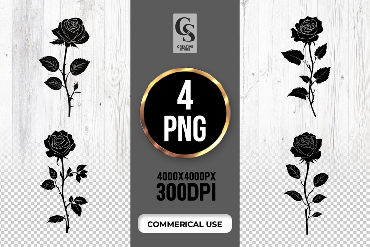 4 Black Rose Silhouette Clipart Sublimation PNG Files Perfect for Greeting Cards, Invitations, Junk Journal, Party Decor, Scrapbooking and many other craft projects.