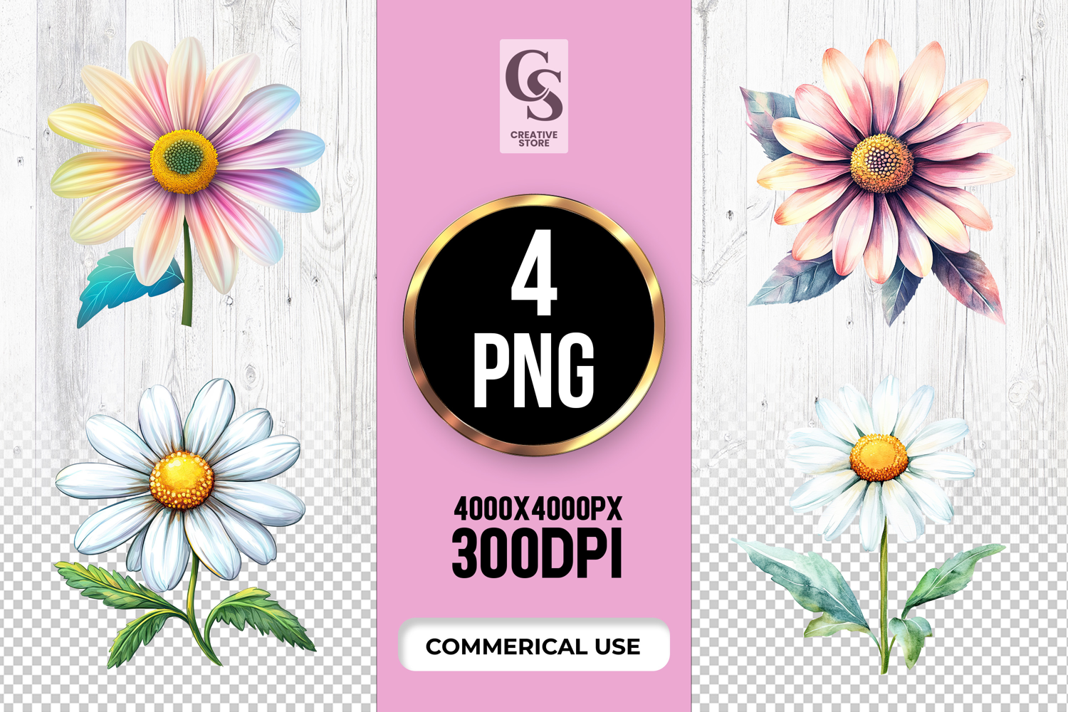 4 Colorful Daisy Flower Clipart Sublimation PNG Files Perfect for Greeting Cards, Invitations, Junk Journal, Party Decor, Scrapbooking and many other craft projects.