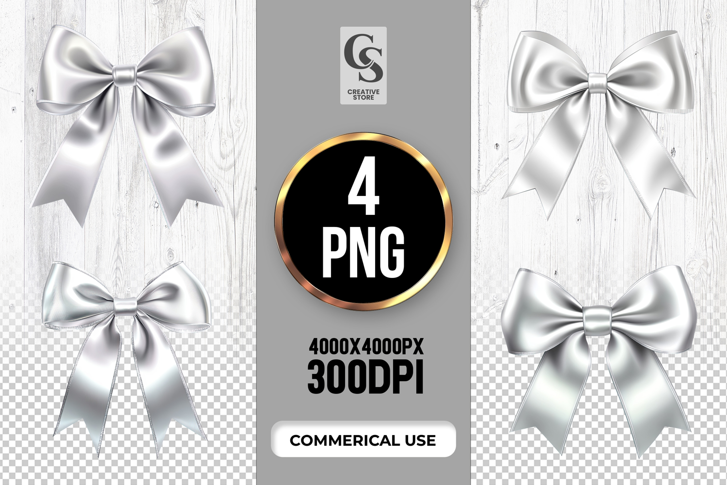 4 Silver Satin Ribbon Bow Clipart Sublimation PNG Files Perfect for Greeting Cards, Invitations, Junk Journal, Party Decor, Scrapbooking and many other craft projects.