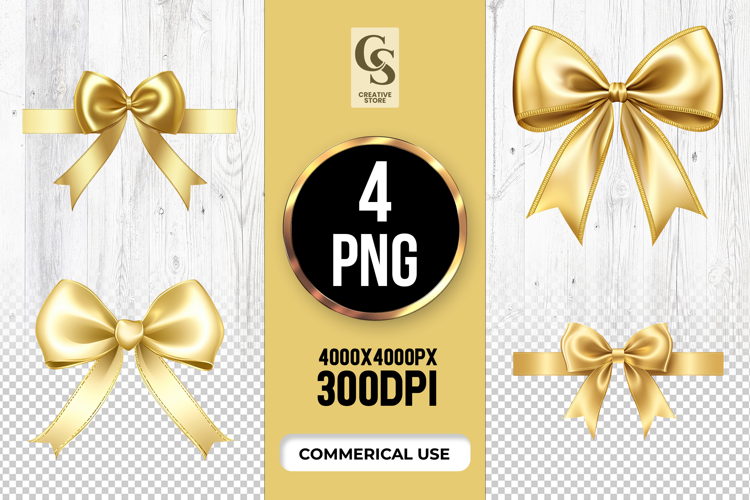 4 Gold Satin Ribbon Bow Clipart Sublimation PNG Files Perfect for Greeting Cards, Invitations, Junk Journal, Party Decor, Scrapbooking and many other craft projects.