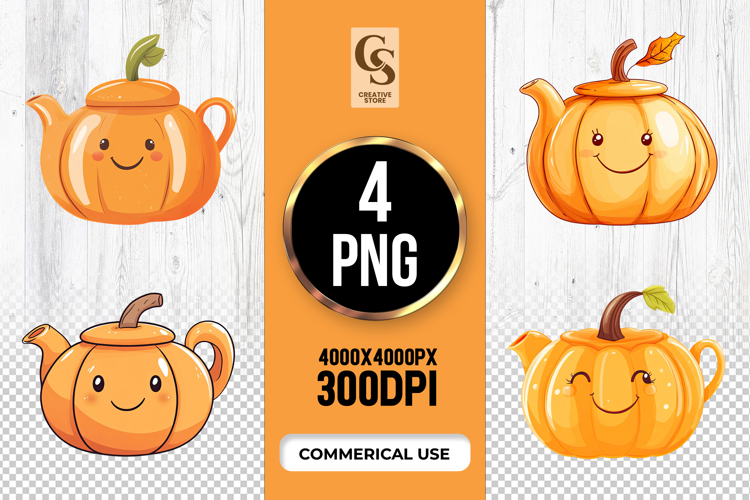 4 Cute Kawaii Pumpkin Teapot Clipart Sublimation PNG Files Perfect for Greeting Cards, Invitations, Junk Journal, Party Decor, Scrapbooking and many other craft projects.