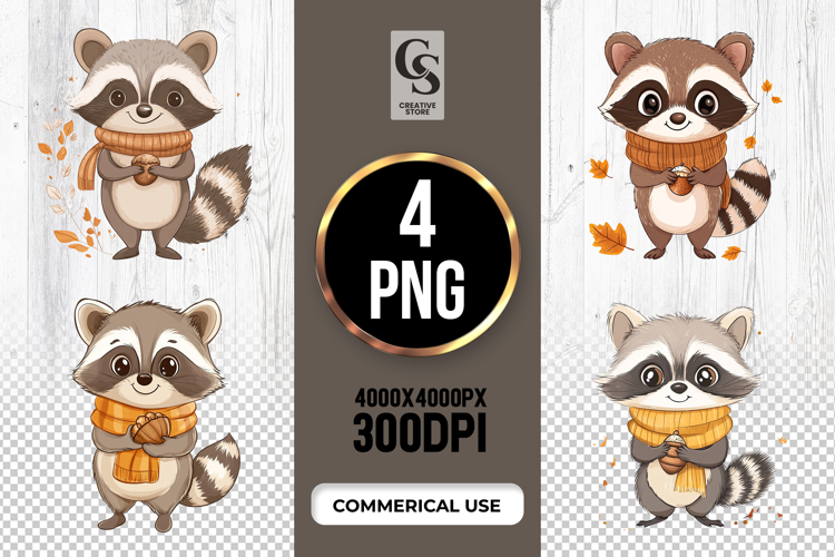 4 Autumn Raccoon Clipart Sublimation PNG Files Perfect for Greeting Cards, Invitations, Junk Journal, Party Decor, Scrapbooking and many other craft projects.