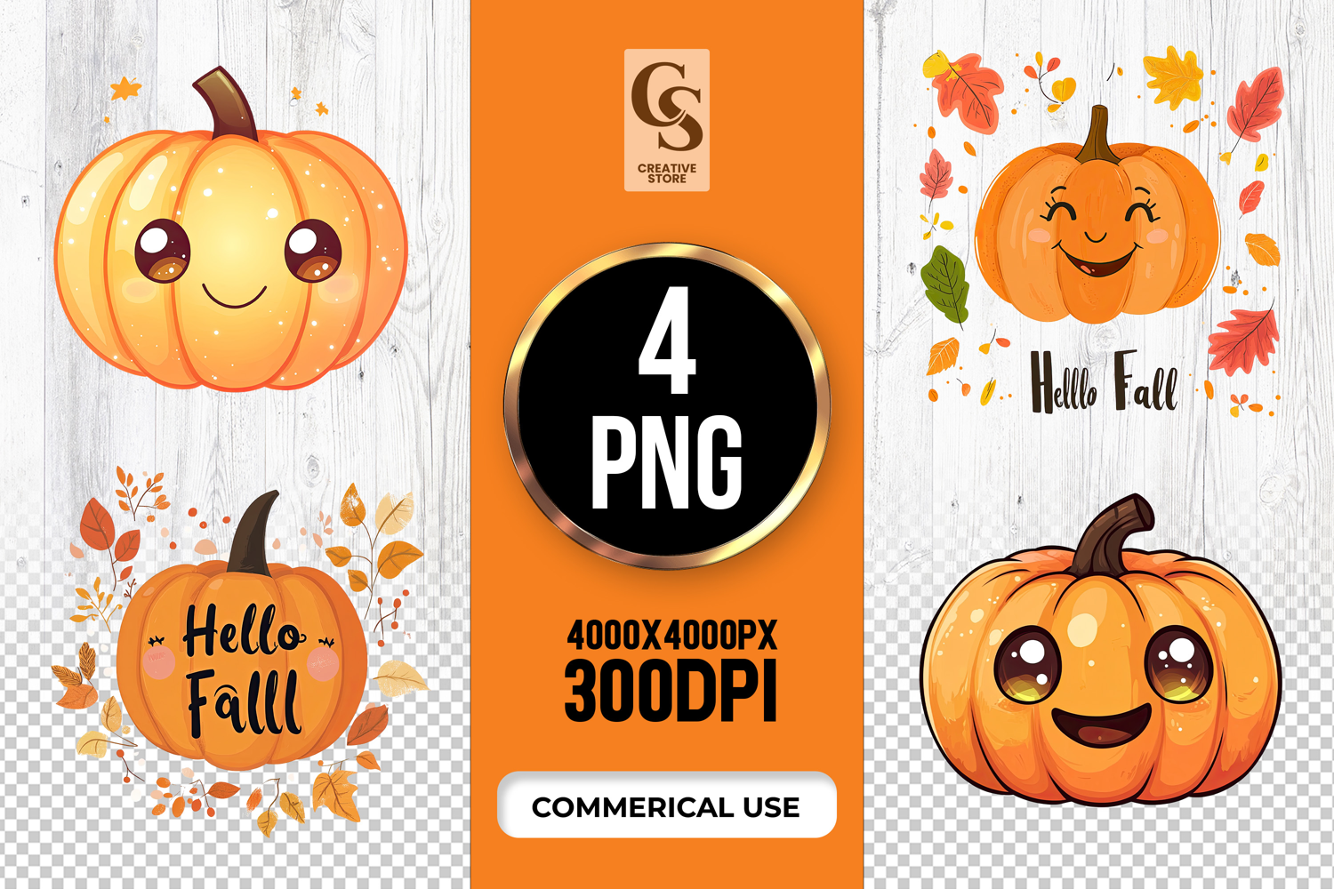 4 Hello Fall Pumpkin Clipart PNG Files Perfect for Greeting Cards, Invitations, Junk Journal, Party Decor, Scrapbooking and many other craft projects.