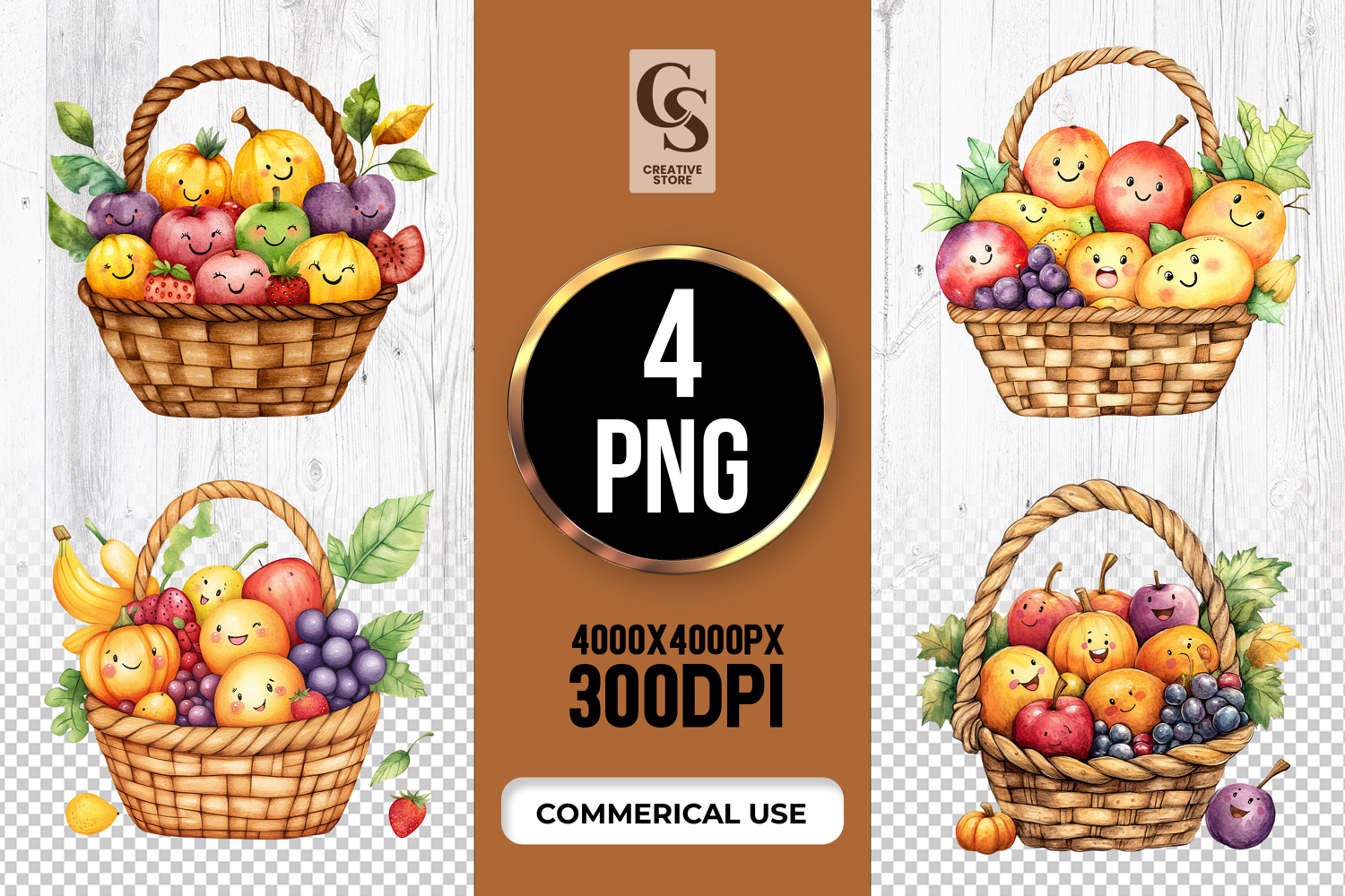 4 Fruit Basket Clipart Sublimation PNG Files Perfect for Greeting Cards, Invitations, Junk Journal, Party Decor, Scrapbooking and many other craft projects.