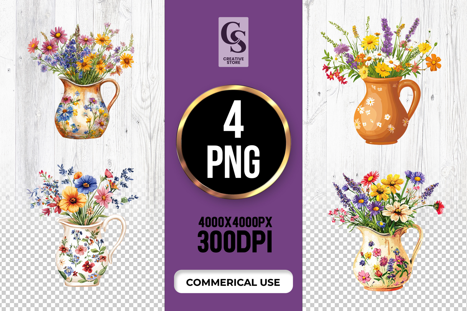 4 Floral Pitcher Clipart Sublimation PNG Files Perfect for Greeting Cards, Invitations, Junk Journal, Party Decor, Scrapbooking and many other craft projects.