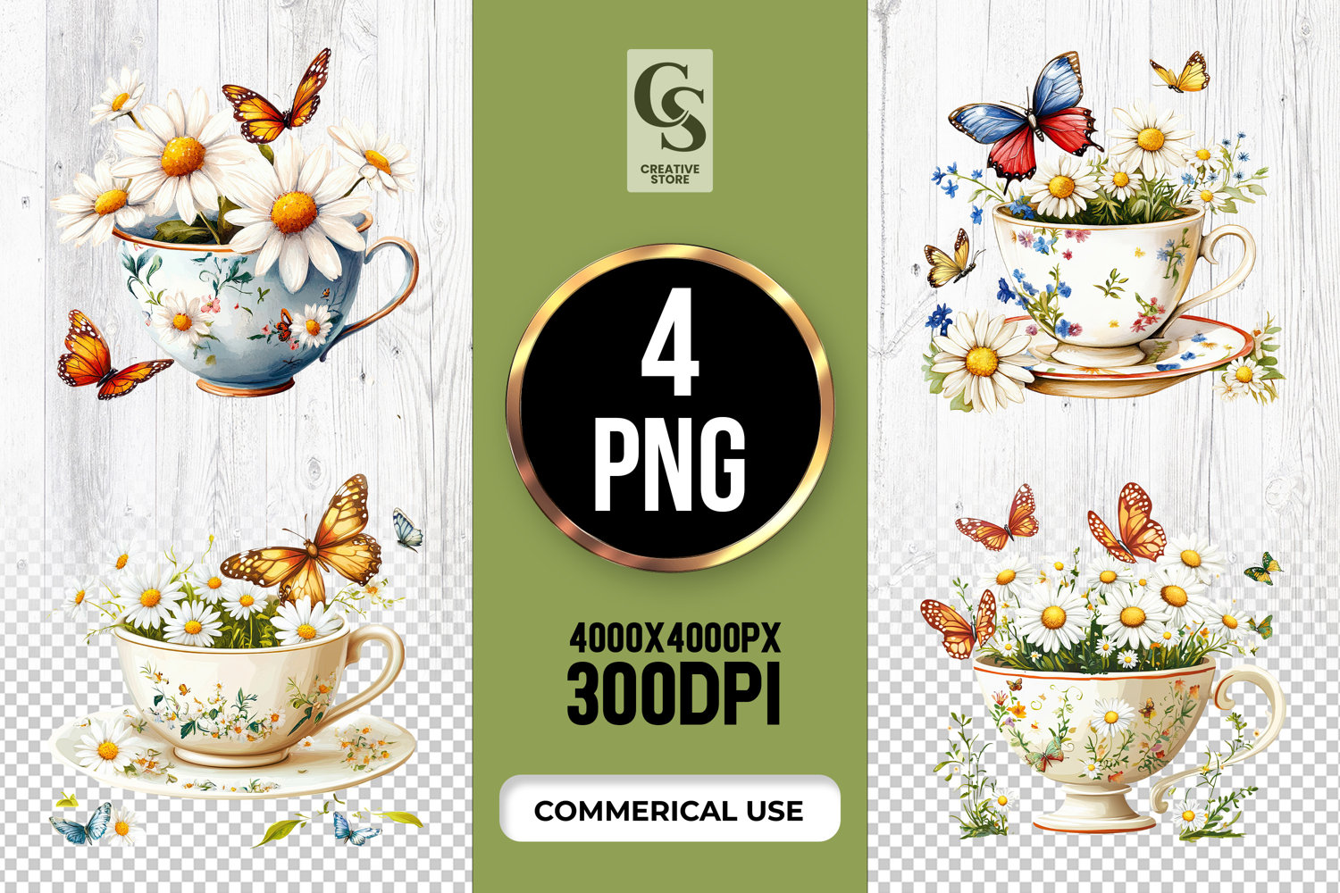 4 Butterfly Teacup Floral Clipart Sublimation PNG Files Perfect for Greeting Cards, Invitations, Junk Journal, Party Decor, Scrapbooking and many other craft projects.