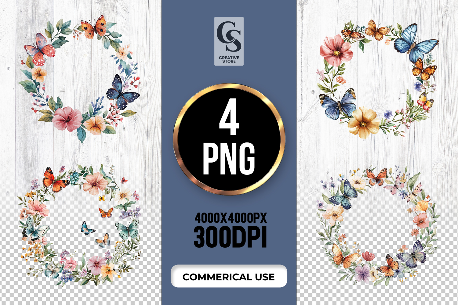 4 Butterfly Floral Wreath Clipart Sublimation PNG Files Perfect for Greeting Cards, Invitations, Junk Journal, Party Decor, Scrapbooking and many other craft projects.