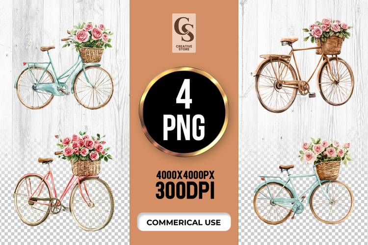 4 Vintage Bicycle With Flowers Clipart Sublimation PNG Files Perfect for Greeting Cards, Invitations, Junk Journal, Party Decor, Scrapbooking and many other craft projects.